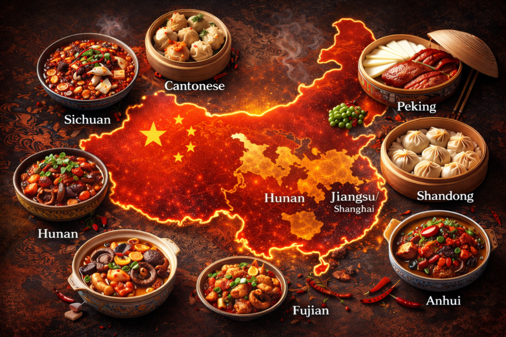 Du piquant du Sichuan à la délicatesse cantonaise, la cuisine chinoise est un univers aussi vaste que la Chine elle-même. A l’occasion de la Golden Week, découvrez les grandes traditions culinaires régionales, leurs saveurs typiques et quelques plats emblématiques qui font voyager les papilles. Découvrir les huit grandes cuisines chinoises (八大菜系, bādà càixì), c’est explorer un pays dans toute sa diversité. Chaque région raconte une histoire culinaire, entre épices, douceur, croquant et subtilité. Bon appétit à tous !